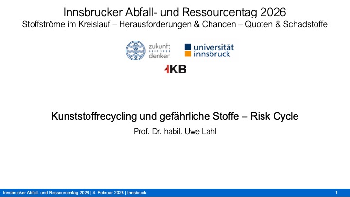 Neue Kunststoffe bestehen aus immer komplexeren Additivrezepturen und Polymeren. Kann das Recycling von gemischten Verpackungskunststoffen neue Produkte überhaupt noch sicher machen oder ist der Rezyklat-Einsatz in verbrauchernahen Produkten sogar gefährlich? In seinem Vortrag auf dem Innsbrucker Abfall- und Ressourcentag 2026 am 4.2.2026 zum Thema „Kunststoffrecycling und gefährliche Stoffe – Risk Cycle“ befasst sich Prof. Dr. Uwe Lahl nicht nur mit diesen Fragen, sondern stellt auch die neuesten Erkenntnisse und politischen Entwicklungen hierzu dar. Unten finden Sie einen Link zum Programmflyer sowie zur Webseite der Tagung mit dem Anmeldeformular.
